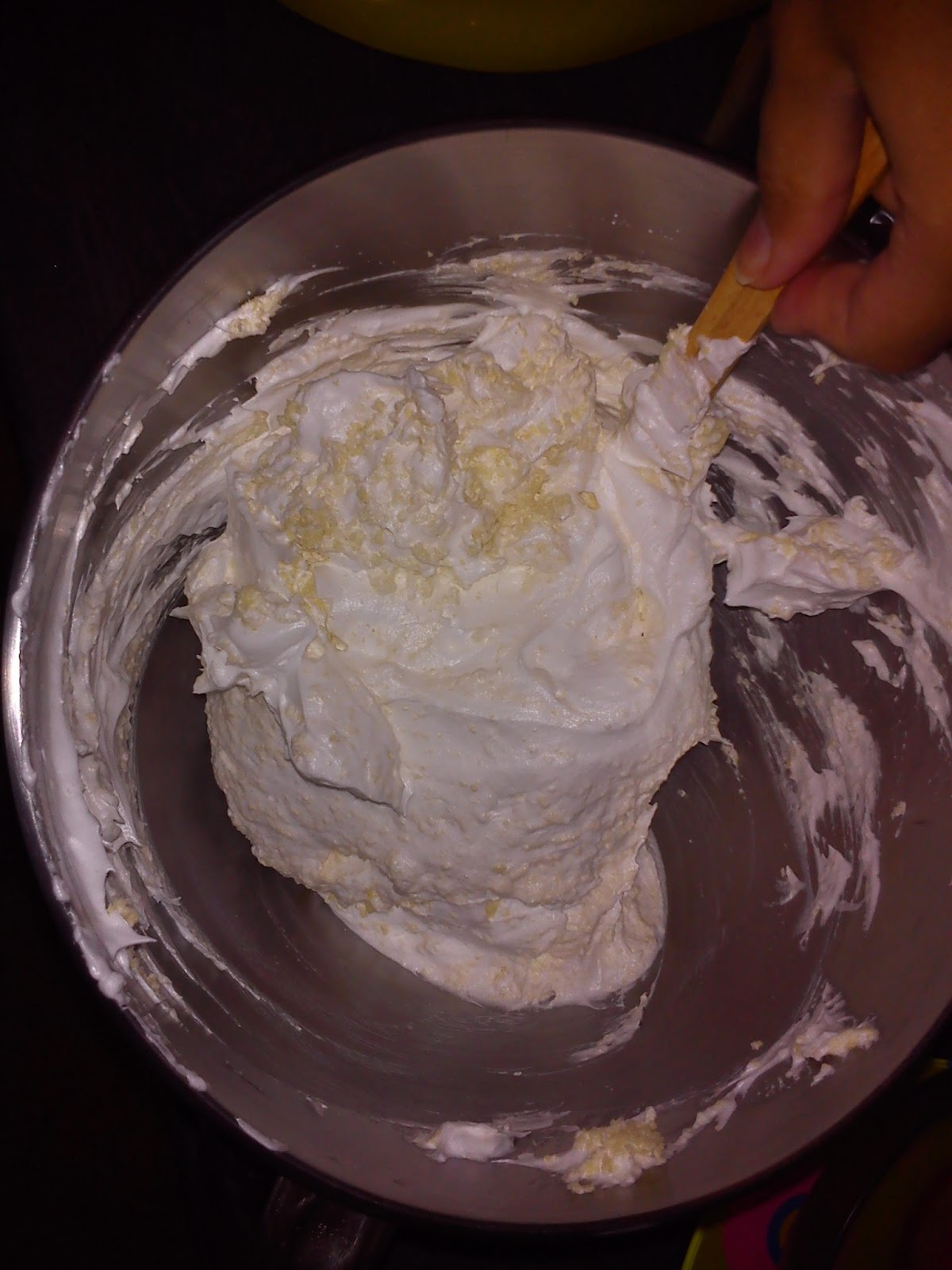 - Lorsque la meringue est prête, Mu verse la poudre d'amande dessus.